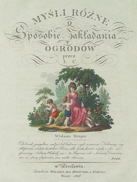 Die erste Ausgabe erscheint 1805, weitere Auflagen folgen 1807 und 1808. In elf Kapiteln beschreibt die Autorin verschiedene Elemente der Gartengestaltung, beispielsweise den Charakter einzelner Gehölze, die Planung von Wegen, Sichtachsen und Begrenzungen oder das ästhetische Zusammenwirken von Pflanzen, Denkmälern und Gartenarchitekturen. Das umfangreichste Kapitel ist dem Clump als einem wirkungsvollen Gestaltungsmittel des Landschaftsgartens gewidmet. Der englische Begriff bezeichnet in Gruppen arrangierte Anpflanzungen zeitlich versetzt blühender Gehölze, Sträucher und Blumen. Czartoryskas sinnliche Beschreibungen der Pflanzenkombinationen wecken Assoziationen eines gelungenen Zusammenspiels von Licht und Schatten, Farbe und Form, Bewegung und Duft bei wechselnden Witterungen und Jahreszeiten. Das Grundprinzip bei der Zusammenstellung sei es, die Arten so auszuwählen und anzuordnen, „dass sie die stärksten Kontraste und Spielarten aufweisen, in den Formen, in der Belaubung, in den Grüntönen, in der Blüte, und dadurch die einen die anderen zur Geltung bringen“.