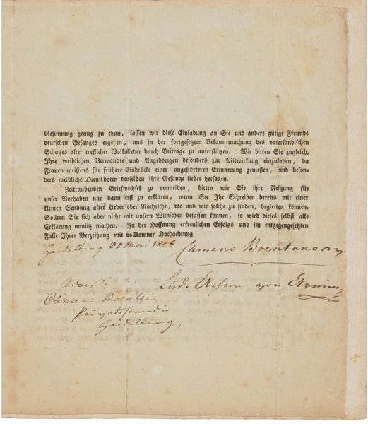 Das Rundschreiben richtet sich, wie der Titel nahelegt, an „Freunde deutscher Art und Kunst [in der Schweiz]“, jedoch nicht ausschließlich an Männer, sondern auch an Frauen, „da Frauen meistens für frühere Eindrücke einer ungestörteren Erinnerung genießen“. 500 Exemplare lässt Brentano drucken. Damit ist es der erste groß angelegte Aufruf zur volkskundlichen Forschung. Knapp zehn Jahre später, im Jahr 1815, wird Jacob Grimm einen ähnlichen Aufruf unternehmen, um Texte für die bekannte Märchensammlung zu erhalten. Eines der Exemplare von Brentanos Aufruf fand durch eine großzügige Bücherschenkung im Jahr 2021 seinen Weg in die Herzogin Anna Amalia Bibliothek – wofür die Klassik Stiftung Weimar nochmals ihren herzlichen Dank ausspricht!