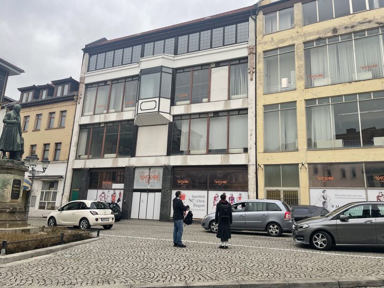 Risse, Formen und Spuren an einer unscheinbaren Fassade: Was hat ein verlassenes Gebäude mit uns und der jüdischen Geschichte in Apolda zu tun? Silvan Gottschall über ein Format, das das Sprachlabor unterwegs zusammen mit dem Prager Haus e.V. vor dem einst renommierten Kaufhaus „Becker und Salinger“ angeboten hat.