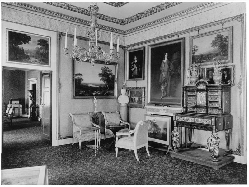 Schriftliche Nachweise zu finden, wann das Gemälde unter welchem Künstlernamen im Schloss hing, ist nicht leicht. In vielen Inventarbüchern zur Einrichtung der Schlossräume sind ausgerechnet Gemälde nur selten erwähnt. Aber im Fall des Ecksalons von Carl Alexander haben wir Glück. In der Auflistung zur Feuerversicherung 1886 sind Werke vermerkt, von denen einige auf der Fotografie wiederzufinden sind: zum Beispiel ein Porträt mit einer „Figur (von Honthorst 1641)“ oder „2 große Oelbilder, Landschaften (von Hackert)“, von denen eines links an der Wand und das andere rechts über dem Kabinettschrank hängt.